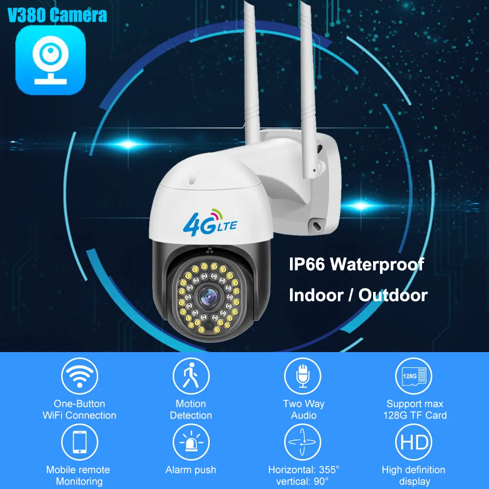 • Caméra de sécurité extérieure PTZ IP66 avec carte SIM 4G, vision nocturne IR colorée, suivi automatique