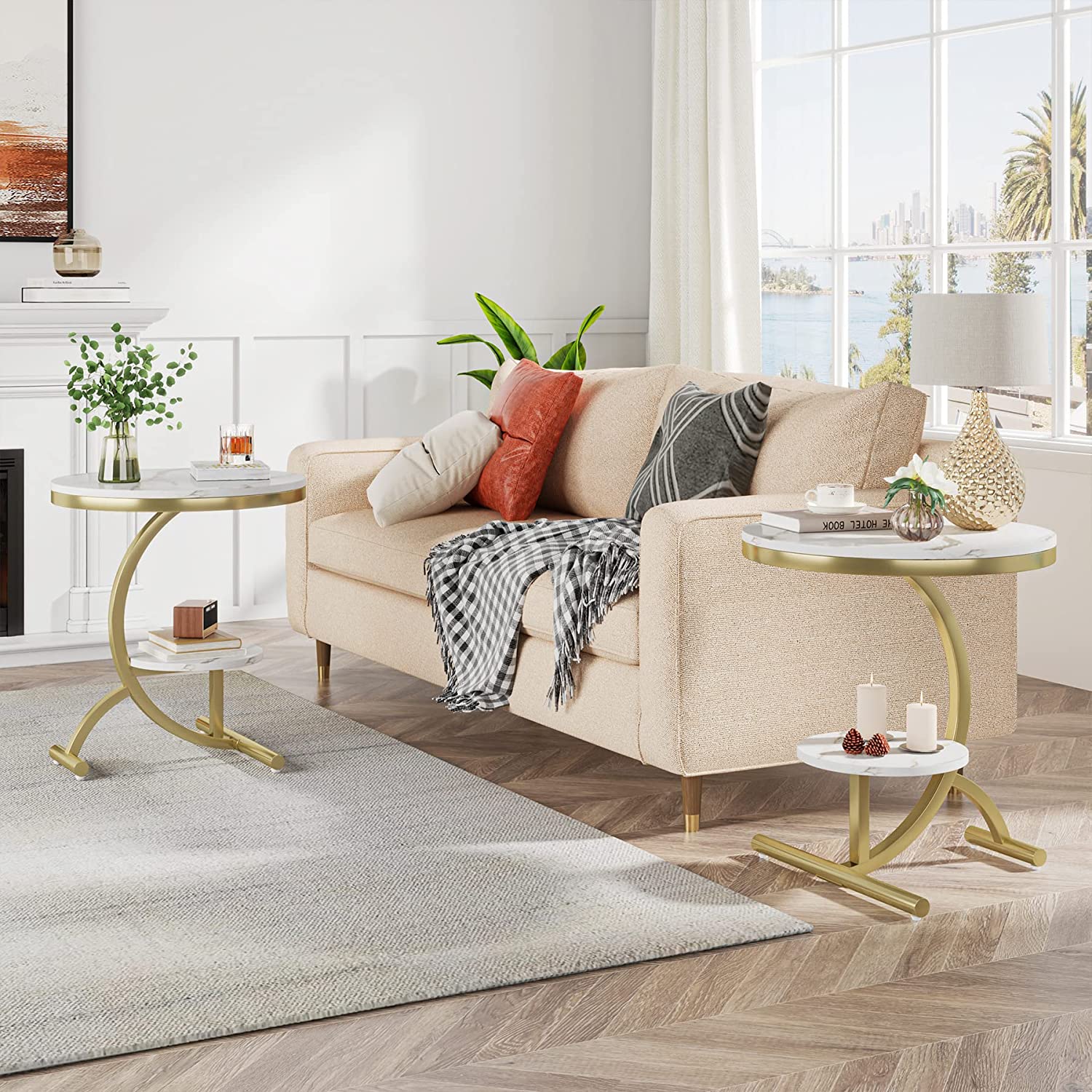 MATÉRIAU DE QUALITÉ SUPÉRIEURE  – La base de cette table d'appoint ronde est conçue avec une construction en acier de forme triangulaire. Le plateau en MDF imitation marbre est facile à nettoyer, imperméable, anti-abrasion, résistant à la chaleur et facile à rayer. Quatre patins antidérapants sur le dessous le rendent plus stable et peuvent éviter les rayures sur le sol.