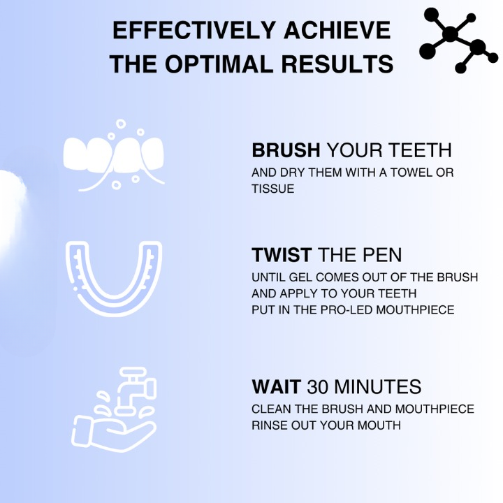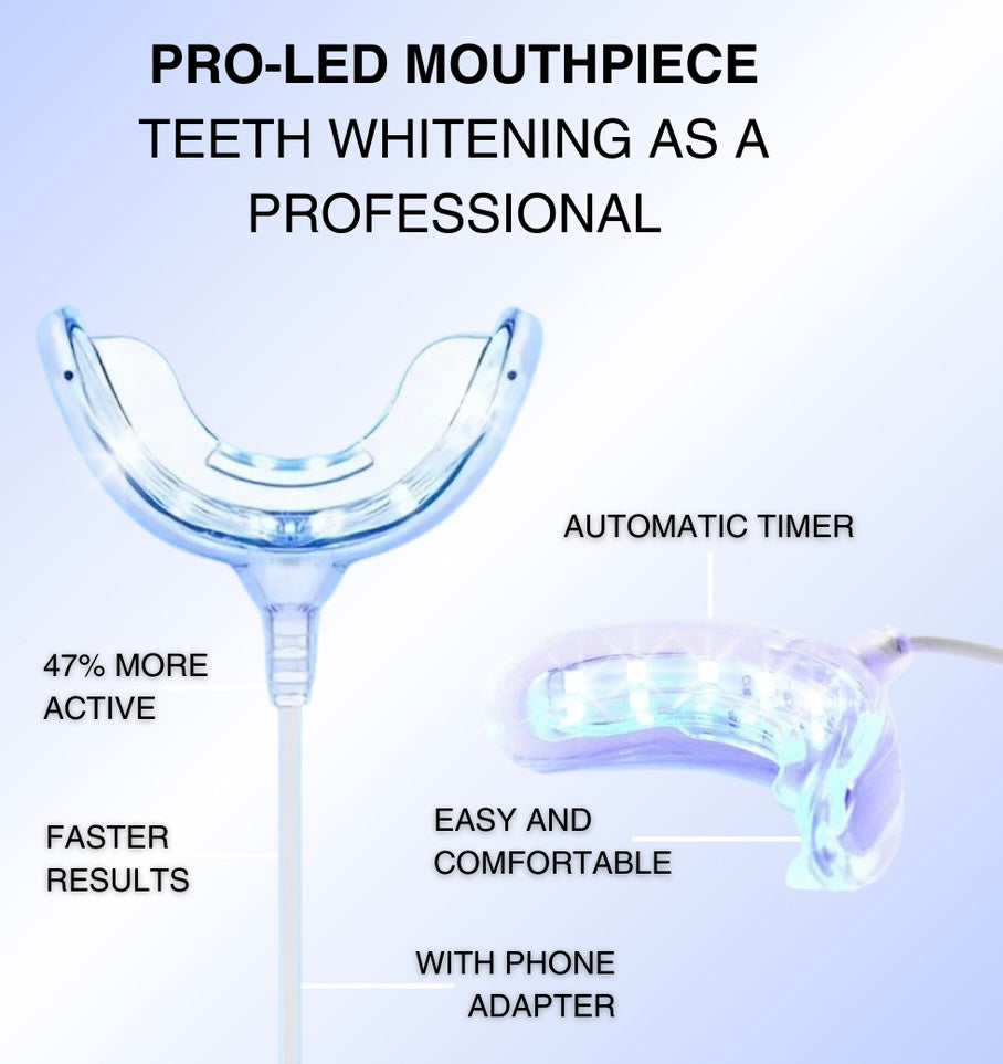 Vous souffrez de décolorations dentaires dues au café, au vin ou au tabac, ou vous n'êtes tout simplement pas satisfait de la blancheur de votre sourire ? Le kit de blanchiment LED offre la solution idéale. Un sourire blanc et éclatant est désormais à portée de main en seulement 10 minutes par traitement. Là où vous deviez auparavant payer des frais élevés dans un salon de blanchiment ou chez le dentiste, vous pouvez désormais blanchir vos dents facilement à domicile quand cela vous convient. Grâce à la combinaison du gel PAP+ puissant et de la lumière UV bleue professionnelle du Kit LED, le gel blanchissant devient jusqu'à 47 % plus efficace, ce qui fait disparaître plus rapidement les taches et les décolorations.