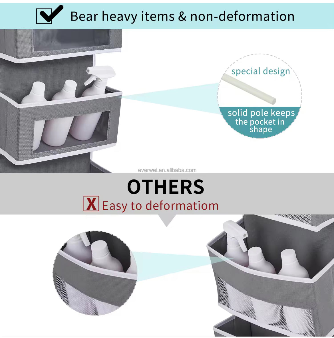 Notre solution de rangement se distingue par sa capacité importante et sa construction robuste. Contrairement aux organisateurs traditionnels, le nôtre est conçu avec des poches latérales en filet supplémentaires pour les petits objets essentiels et un support en tube de fibre de verre pour plus de durabilité.