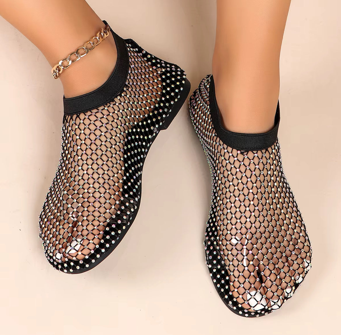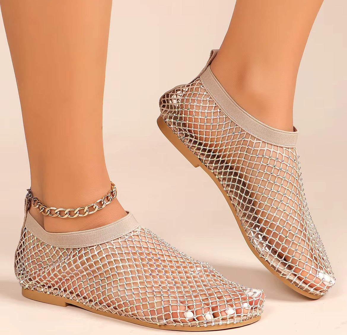 La partie supérieure de ces chaussures plates est fabriquée à partir d'un matériau en maille respirante et transparente. Il offre non seulement un look contemporain et moderne, mais garantit également que vos pieds restent frais et confortables toute la journée.